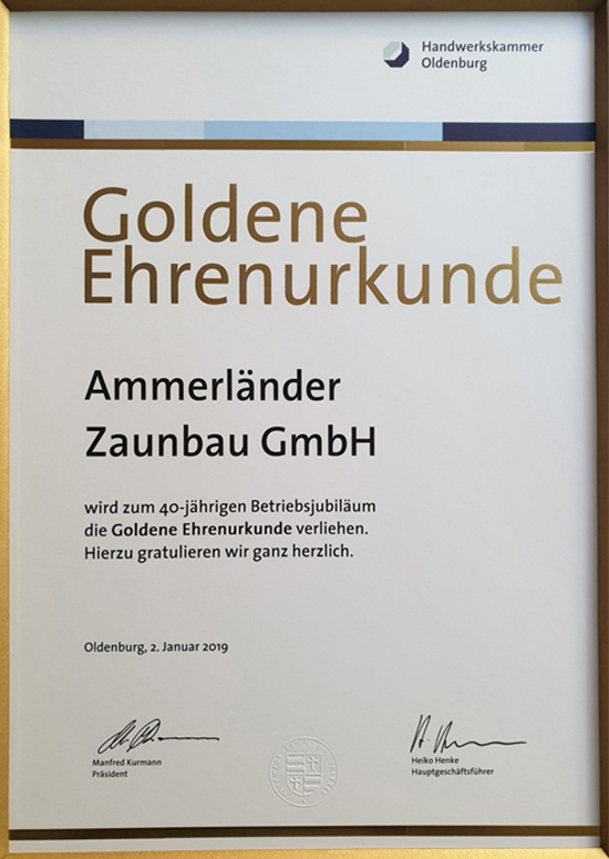 Unser Unternehmen Ammerländer Zaunbau GmbH wurde 1979 von Albert Buss gegründet und aufgebaut. In diesen 40 Jahren sind wir mit der Herstellung und Montage von Zaun- und Toranlagen gewachsen und können mit dieser Erfahrung genau die Lösung finden, die Sie als Kunde zufrieden stellt. Mit dem Ziel, keine Kundenwünsche offen zu lassen, wird das Unternehmen inzwischen in zweiter Generation geleitet und fortgeführt.